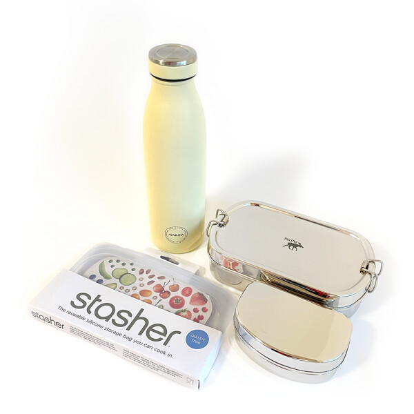 Det gør i stedet en skolepakke som denne. Med madkasse, drikkedunk af rustfrit metal og stasher-poser i silikone er der til mange års madpakker.